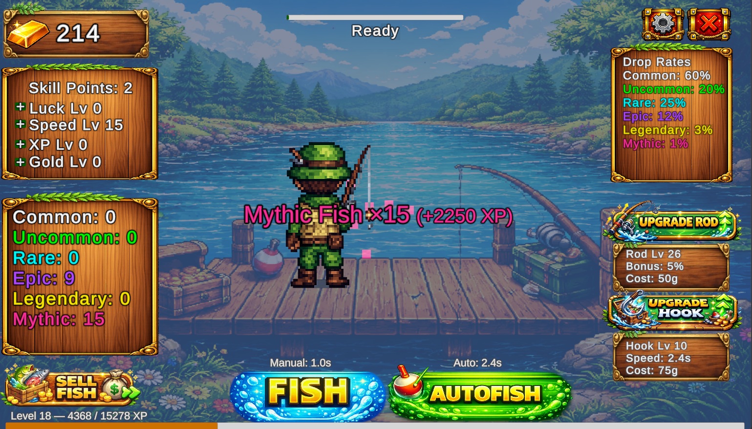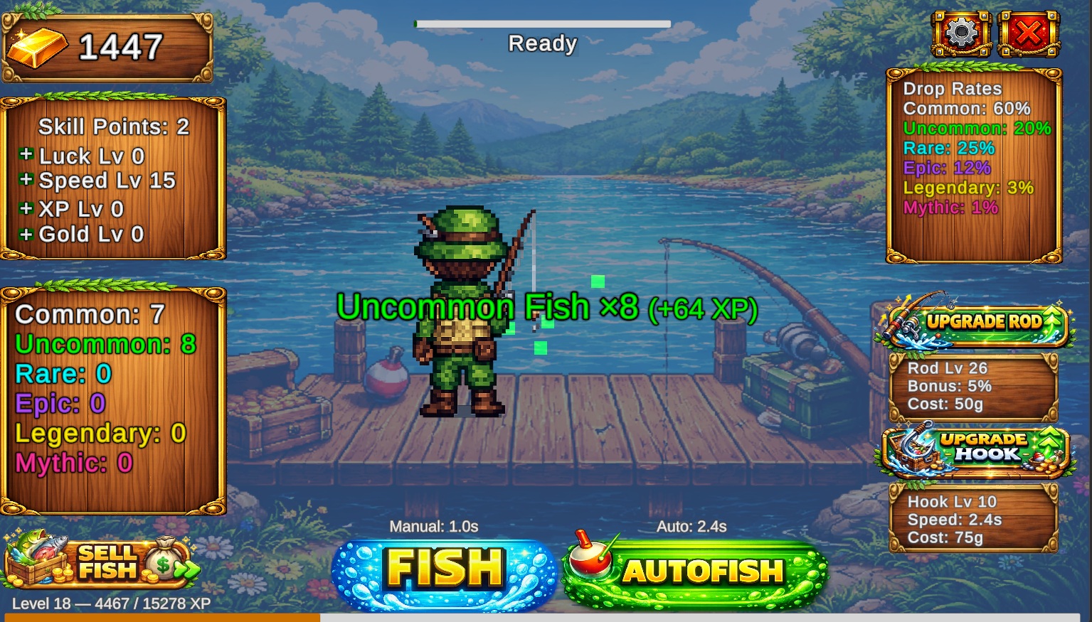 A relaxing idle fishing game where you catch rare fish, upgrade your gear, and build the ultimate fishing setup. Level up, spend skill points, and chase Mythic catches.